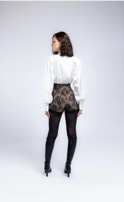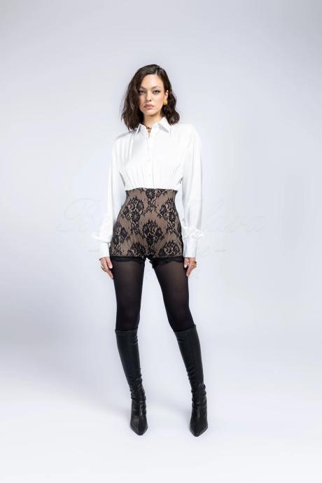 Jumpsuit corta raffinata composta da una camicia in satin con spalline sottili e culotte in pizzo.