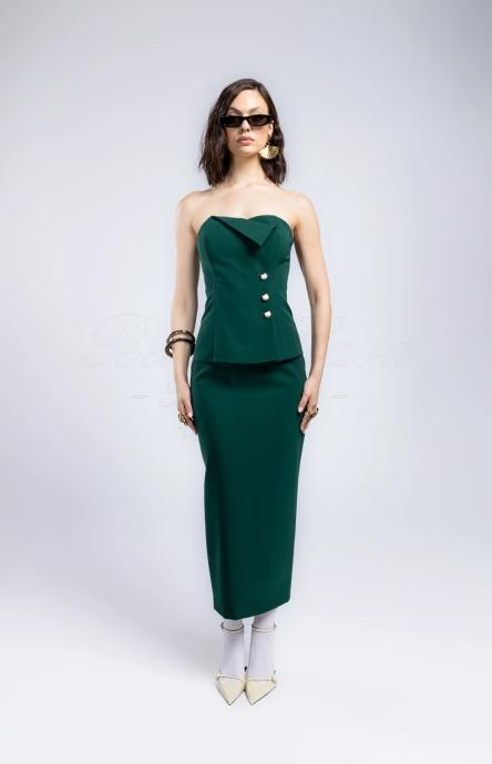Top senza spalline in pregiato tessuto cady, caratterizzato da una superficie liscia e lucida che dona un aspetto elegante e sofisticato. La chiusura con bottoni in perla aggiunge un tocco di raffinatezza al capo. La silhouette aderente valorizza la figura femminile, rendendolo ideale per look da sera o eventi speciali.